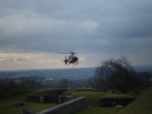 The embankment itself, above the moat, is for the most part steep; estimated to be about 35-40º. Below the embankment is a 10 meter wall, at the base of which is the moat bed, approximately 15-20 meters wide, with a further 10 meter wall providing the outside defenses. The main task was extracting the timber safely. A crane wasn’t an option and neither was man or horse power, so there was only one other possibility – helicopter.